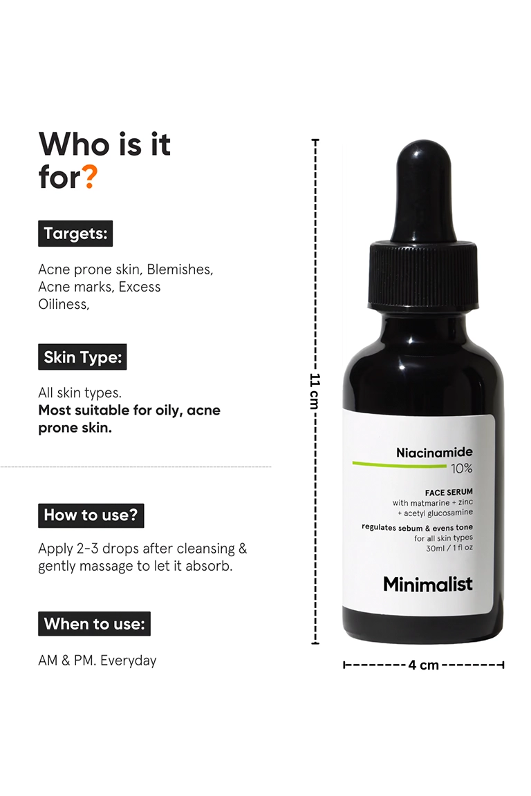 The Minimalist Niacinamide 10% Face Serum is a lightweight, water-based serum designed to improve overall skin texture, control excess oil, and support a clearer complexion. Specially formulated for oily and acne-prone skin, this serum works gently yet effectively to refine pores and strengthen the skin barrier.